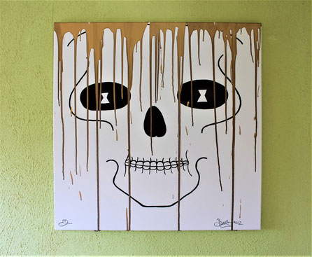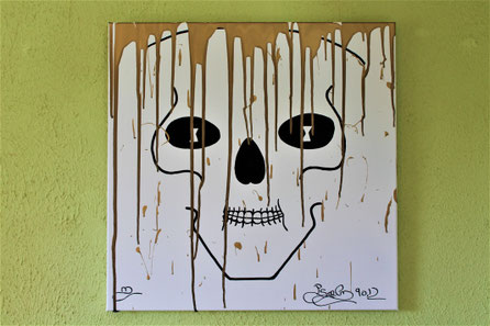 weiße Kreidefarbe, schwarzer Edding und goldener Lack auf Leinwand, Format ca. 80x80 [cm]